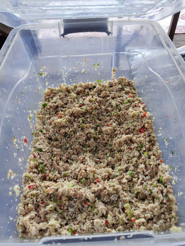 従業員とその家族が自由に参加できるBBQなので、前日から大量の肉をクーラーボックスの中に入れて醤油で仕込みました。その際、クーラーボックスに肉を詰めすぎてかなり重くなり、クーラーの取っ手部分が壊れてしまうハプニングも…。気を取り直して、料理の準備していきます。