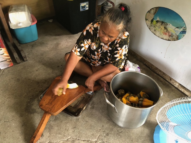 これがキロックの作業。一粒ずつパンダナスを削っていきます。