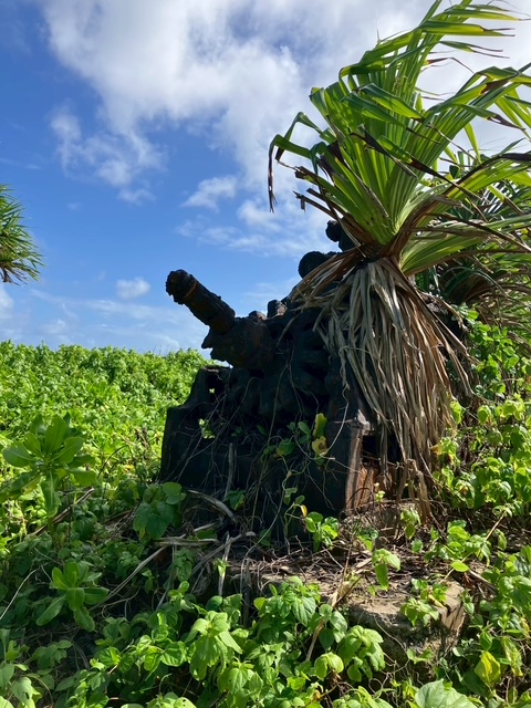 こちらは飛行機のエンジン?らしきもの。草木が生い茂り、ココナッツが絡みつくように生えていました。
