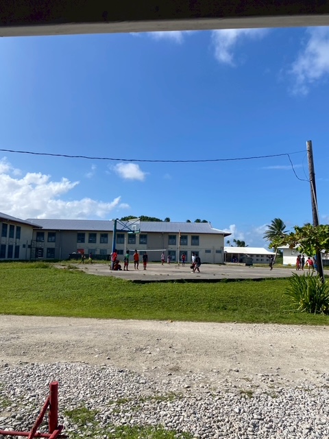 校舎の前ではバスケにいそしむ生徒さんたち。開放的なコートに楽しそうな笑い声が響いていました。